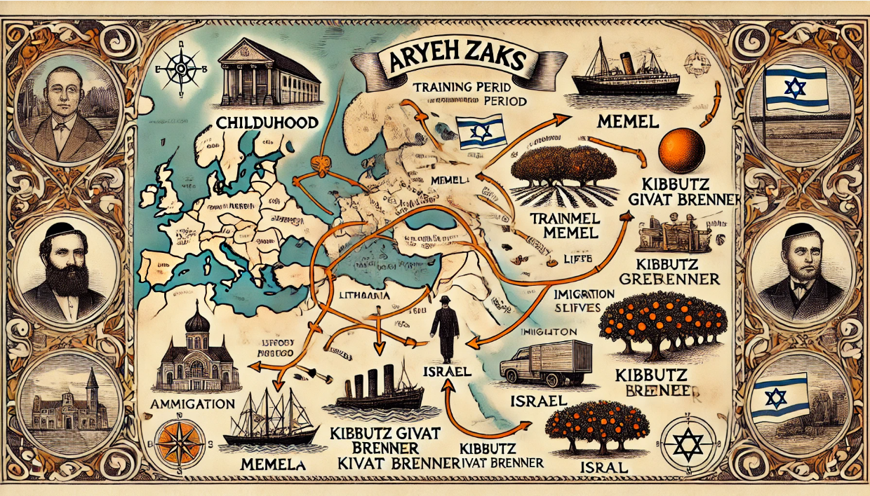 התמונה המוצגת מתארת את המסע שעבר אריה זקס במהלך חייו. מפה זו כוללת את תחנות חייו החשובות, החל מילדותו בליטא, דרך תקופת ההכשרה בממל ועד להגעתו לארץ ישראל. המפה מציגה את מסלול ההגירה שלו, המקומות שבהם שהה ועבד, כמו קיבוץ גבעת ברנר, קיבוץ רמת הכובש ועוד. לצד המפה מופיעות דמויות היסטוריות, סמלים יהודיים וציוניים, ומבנים חשובים כמו ספינות הגירה, בתי כנסת ועוד, הממחישים את הדרך הארוכה שעבר אריה זקס מחייו בליטא ועד להתיישבותו בארץ ישראל.